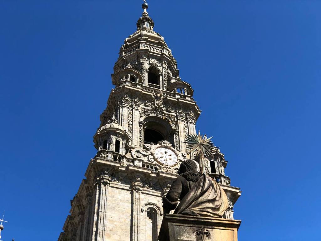 Las escaleras dobles, que por cierto, no podrás subir de dos en dos…, salvan el desnivel del terreno y dejan espacio para la entrada a la cripta a ras de la plaza. Tras ellas un gran retablo de piedra muy decorado con grandes ventanales, escudos, columnas, pináculos y capiteles y la figura de Santiago en lo alto, vestido de peregrino. A los lados las dos torres, que alcanzan los 74 metros de altura.