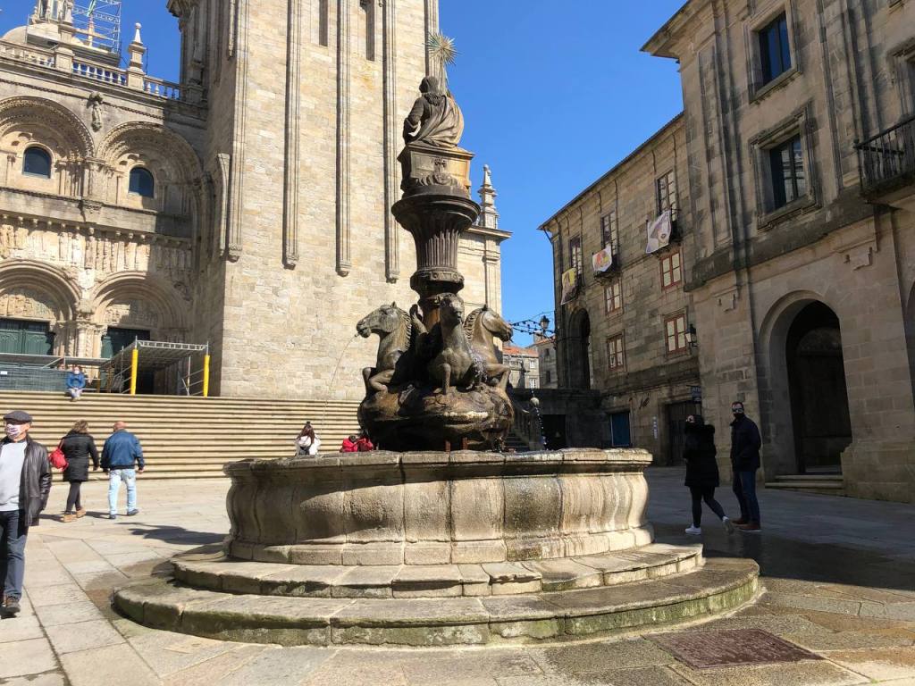 En el centro se encuentra la Fuente de los Caballos, decorada con cuatro caballos marinos que echan agua por sus bocas y una figura femenina que sujeta la estrella de Compostela.