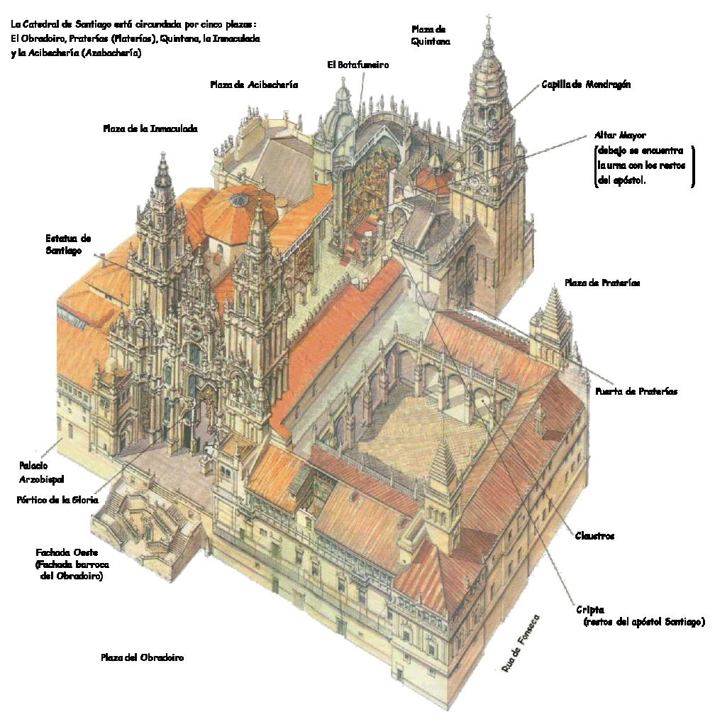 Quintana de Mortos, donde se encuentra el cementerio de canónigos del siglo XVIII, y la Quintana de Vivos, lugar donde se encuentra el antiguo ayuntamiento con la Torre del Reloj.