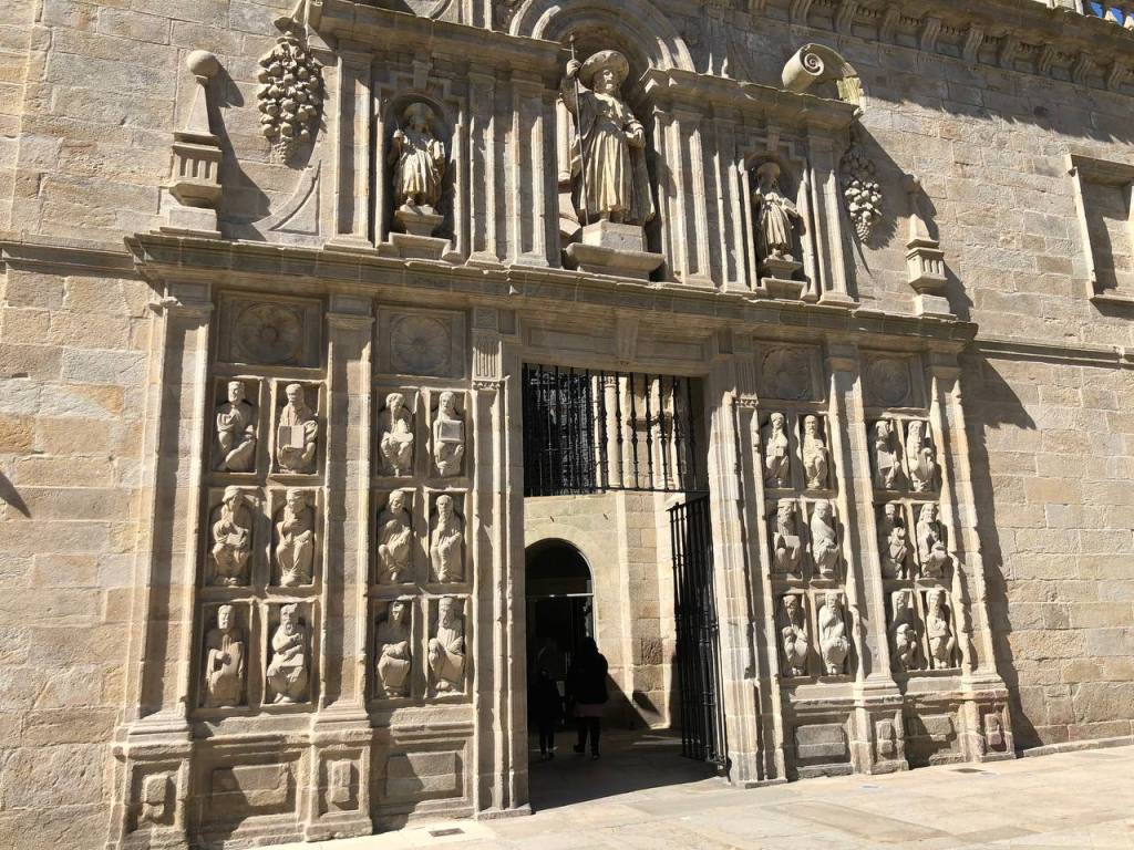 La fachada de la catedral es la del claustro, está decorado con medallones renacentistas con escenas jacobeas, y la figura de María y el Niño. Tras las escaleras se ver la única fachada románica que conserva la catedral a la que le fueron añadidas más figuras románicas traídas de la Puerta del Paraíso, para repararla y enriquecerla con una rica iconografía. En cuanto a la doble puerta, el tímpano de la izquierda se dedicó a las Tentaciones, y en estas tentaciones de Cristo, la escultura de una mujer despeinada y portando una calavera siempre llamó la atención. Hay quien dice que la mujer es Eva y hay quien dice que es la mujer adúltera del Códice Calixtino.